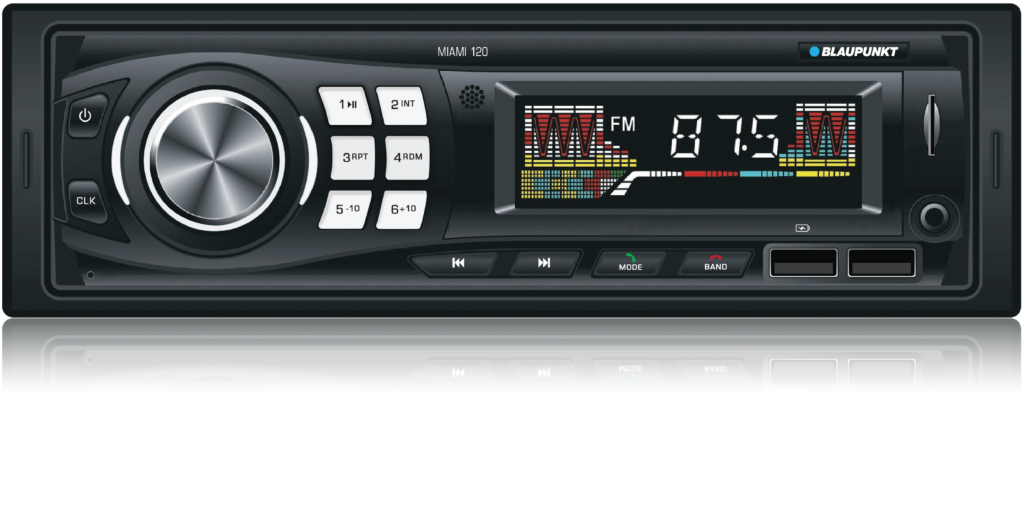 The Miami 120 comes with two USB Port one for playback and one for charging, BT, microSD & Aux-in . You can comfortably browse the songs on your phone to play on the car radio and charge your phone at the same time