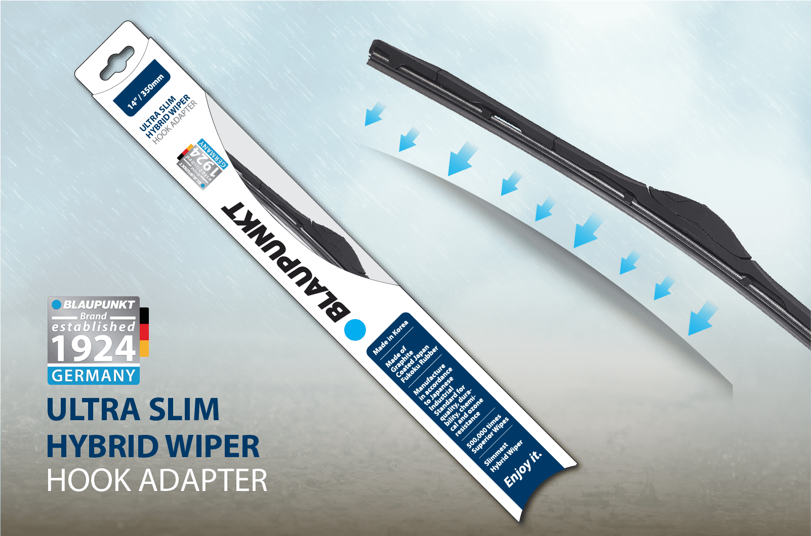 Blaupunkt Ultra Slim Hybrid Wipers Hook Adapter are made of Chloroprene Rubber & Graphite Coating by Fukoku Japan, this material helps to decrease abrasion, friction and deformation from wear and tear. It features Hook Adapter is German engineered to represent as a wiper blade that has an outstanding aerodynamic design that can enables the wiper blades to resist windlift, withstand drag and reduce noise.