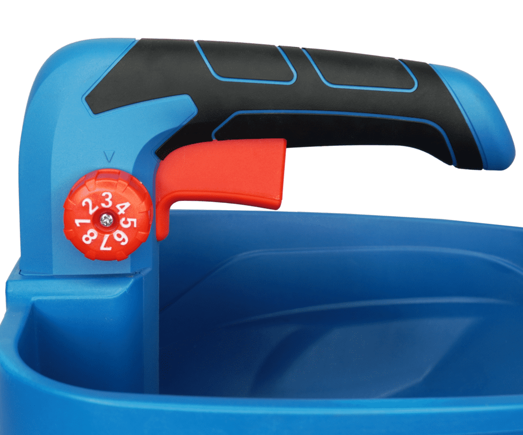 Zbiornik o pojemności 3,3 litra pomieści wystarczającą ilość materiału do obsłużenia standardowej działki ogrodowej. Kompaktowe wymiary 26,5 x 22 x 29,5 cm ułatwiają przechowywanie w garażu lub szopie ogrodowej, a ergonomiczny uchwyt zapewnia pewny chwyt podczas pracy.