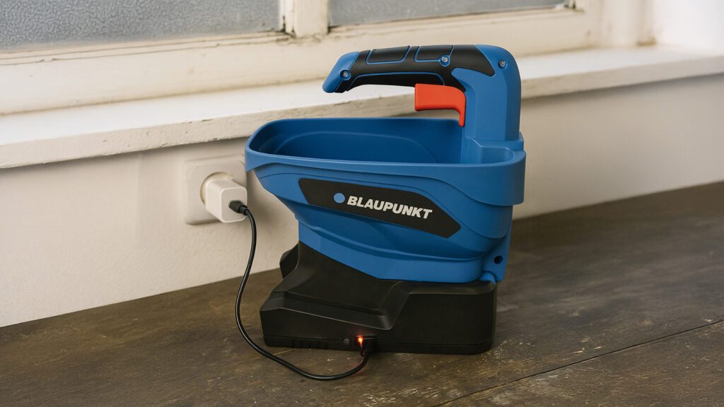Rozsiewacz wyposażony jest w baterię litowo-jonową 7,2V o pojemności 2 Ah, która zapewnia bezprzewodową pracę bez ograniczeń przewodu zasilającego. Ładowanie odbywa się przez popularny port USB-C, co umożliwia użycie standardowych ładowarek. Urządzenie waży 1,55 kg, co pozwala na komfortową pracę bez nadmiernego obciążenia rąk i pleców.