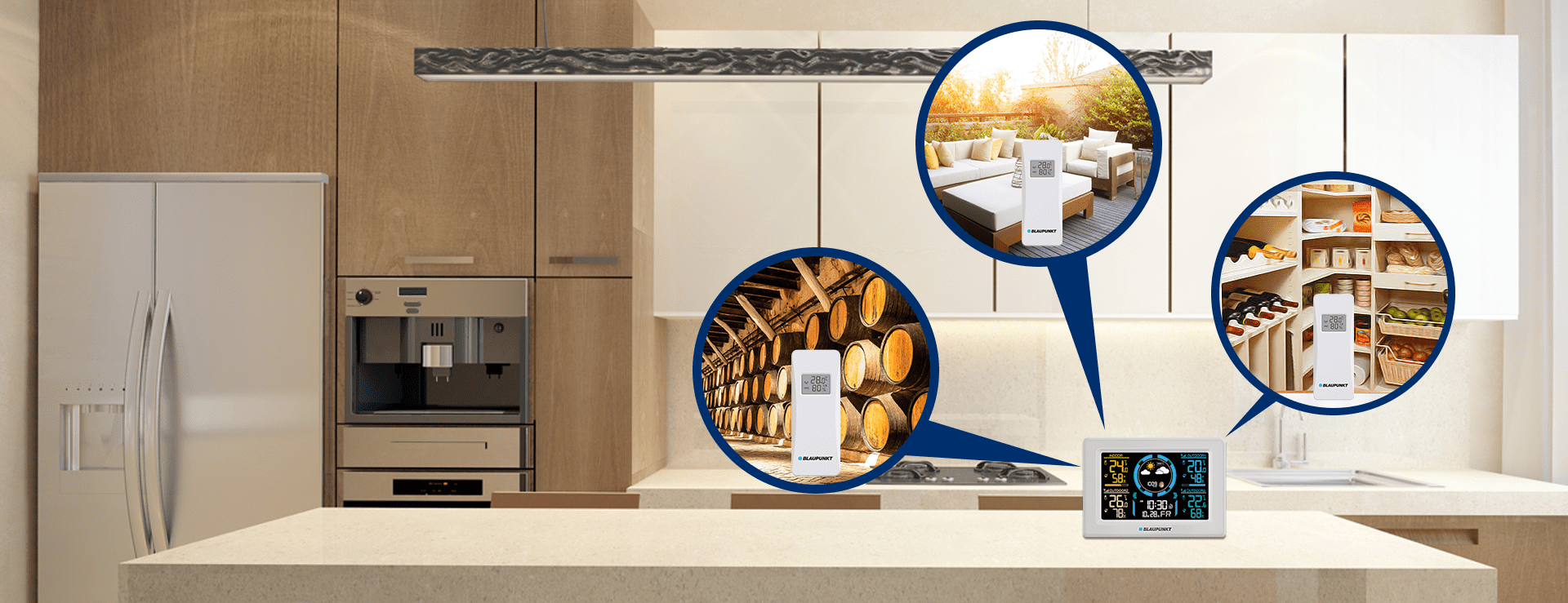 Stacja pogodowa Blaupunkt WS40WH posiada wbudowany czujnik do pomiaru temperatury i wilgotności wewnątrz pomieszczenia, w którym jest zaaplikowana. Dodatkowe, dołączone do zestawu, trzy bezprzewodowe czujniki z wyświetlaczami LCD mogą dokonywać pomiarów na zewnątrz lub w dowolnie wybranej lokalizacji. Dane dotyczące pomiarów zarówno temperatury, jak i wilgotności, są na bieżąco aktualizowane i wyświetlane na wyświetlaczu LCD, wbudowanym w stację pogodową*. Dodatkowo urządzenie posiada pamięć pomiarów najniższych i najwyższych wartości zarówno temperatury, jak i wilgotności, które resetują się automatycznie podczas rozpoczęcia się kolejnej doby. Wartości temperatury mogą być wyświetlane albo w stopniach Celsjusza albo stopniach Farenheita.