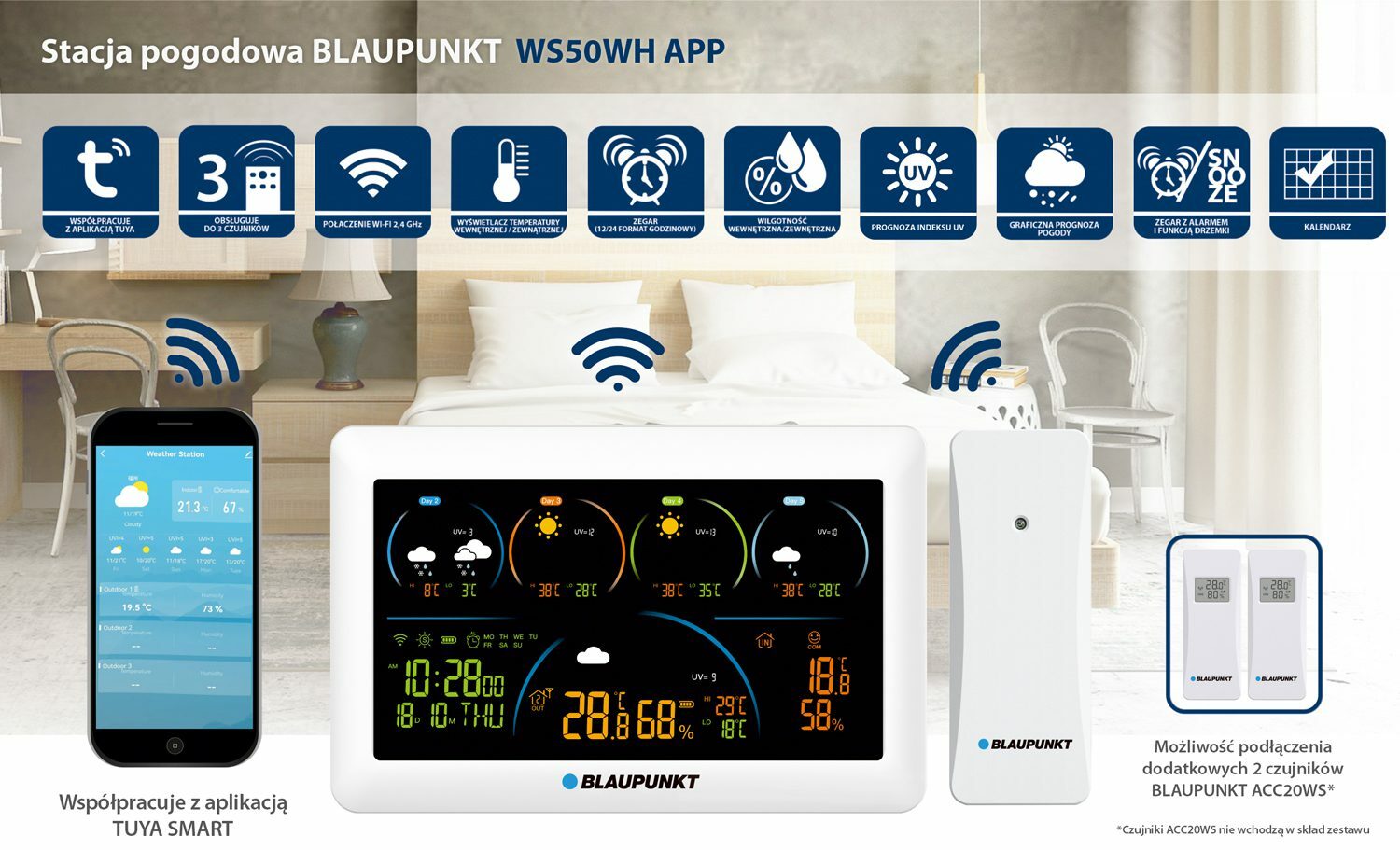 Nie ma problemu. Stacja obsługuje do trzech czujników zewnętrznych, tak więc do dołączonego do zestawu sensora, możesz dokupić dodatkowe dwa opcjonalne czujniki Blaupunkt ACC20WS, ustawić je na odpowiednich kanałach (czujniki posiadają 3 kanały, przełączane manualnie), tak aby sygnały wzajemnie się nie zakłócały i zaaplikować je gdzie tylko chcesz. Potrzebujesz monitorować temperaturę i wilgotność w sypialni, garażu czy przydomowej spiżarni – nic prostszego, pozostaw tam czujnik a wartości pomiarów odczytasz na ekranie stacji pogodowej WS50WH APP, a dzięki wbudowanym w opcjonalne czujniki ACC20WS wyświetlaczom LCD wartość temperatury i wilgotności sprawdzisz też tam, gdzie je postawisz.