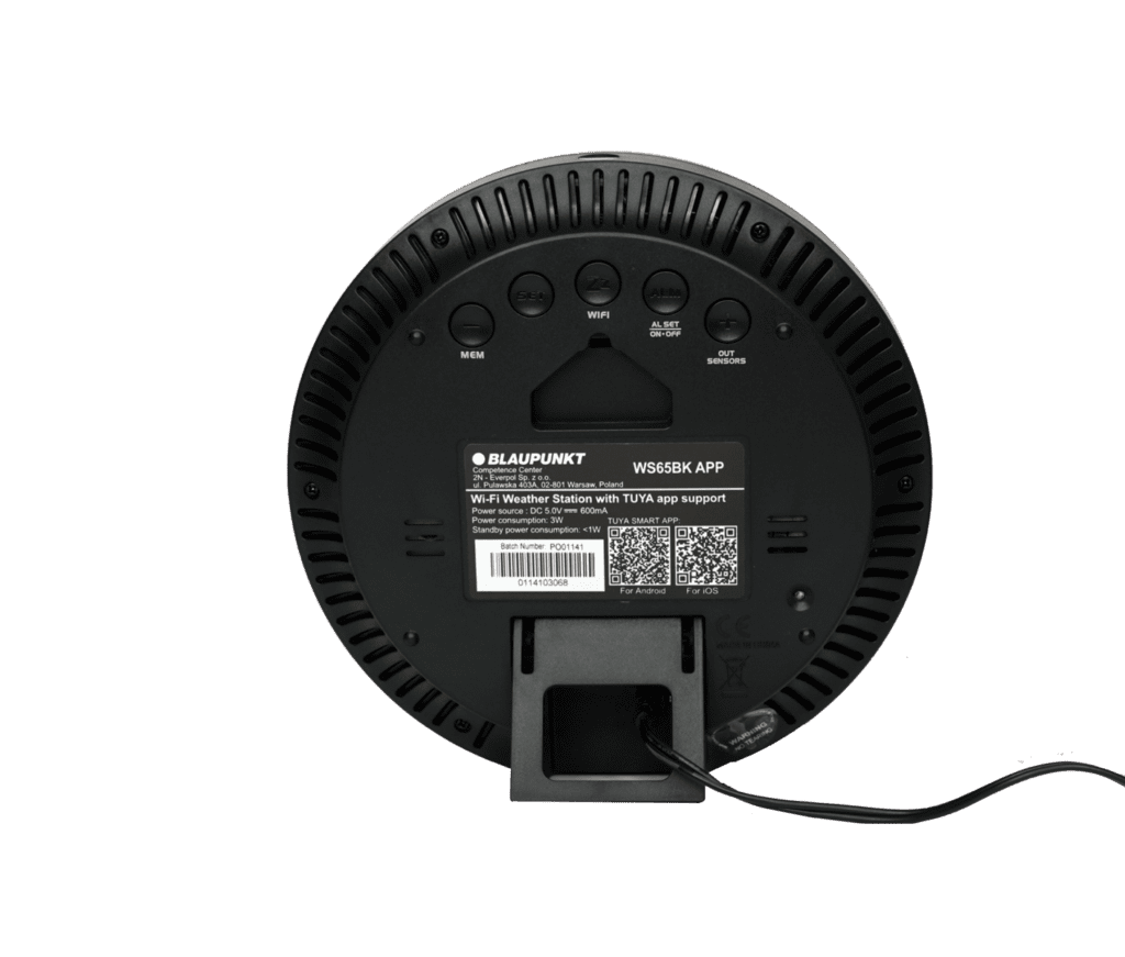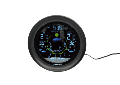 Blaupunkt WS65BK APP to nowoczesna stacja pogodowa, która łączy funkcje monitoringu warunków atmosferycznych z kontrolą jakości powietrza. Urządzenie wyróżnia się okrągłą obudową w eleganckim czarnym kolorze oraz czytelnym, kolorowym wyświetlaczem LCD.