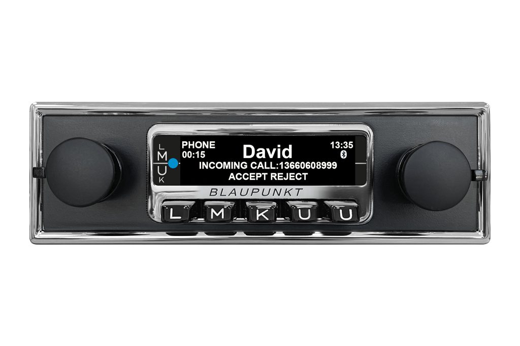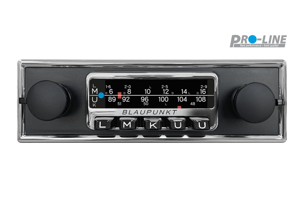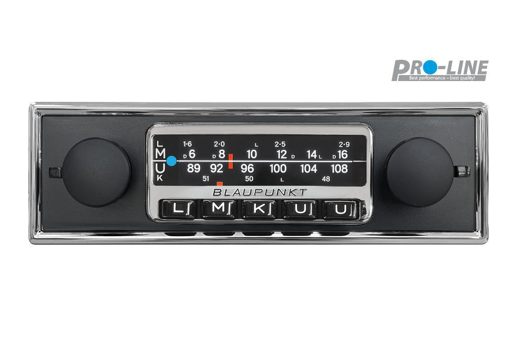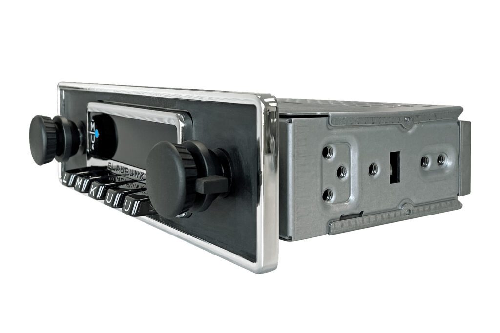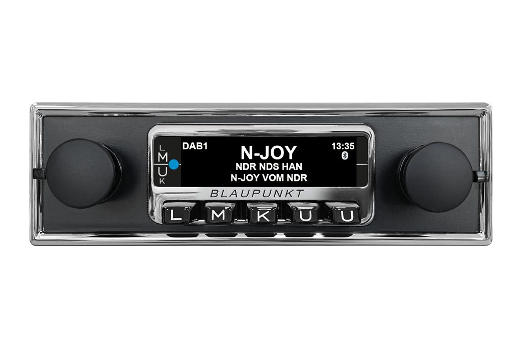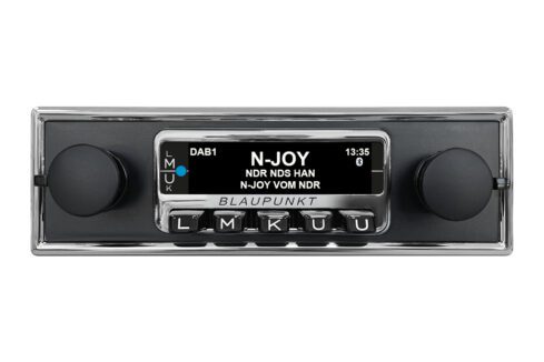 Mit den klassischen Abmessungen der Achsgeräte der 70er, Dreh- und Druckknöpfen sowie der schwarzen Front mit Chromrahmen versprüht das FRANKFURT Stereo authentischen Retro-Charme im Oldtimer-Cockpit. Unter dem zeitlosen Äußeren steckt modernste Technik: Ausgestattet mit dem Blaupunkt Codem IV High-End Tuner bietet es neben FM und AM auch DAB+ für exzellenten Empfang und Klang.