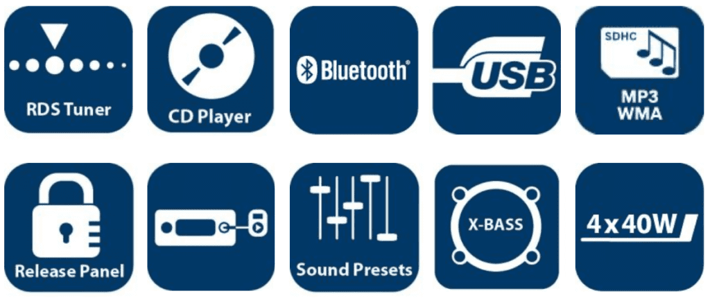 - Playback from CD, USB, SDHC, SD